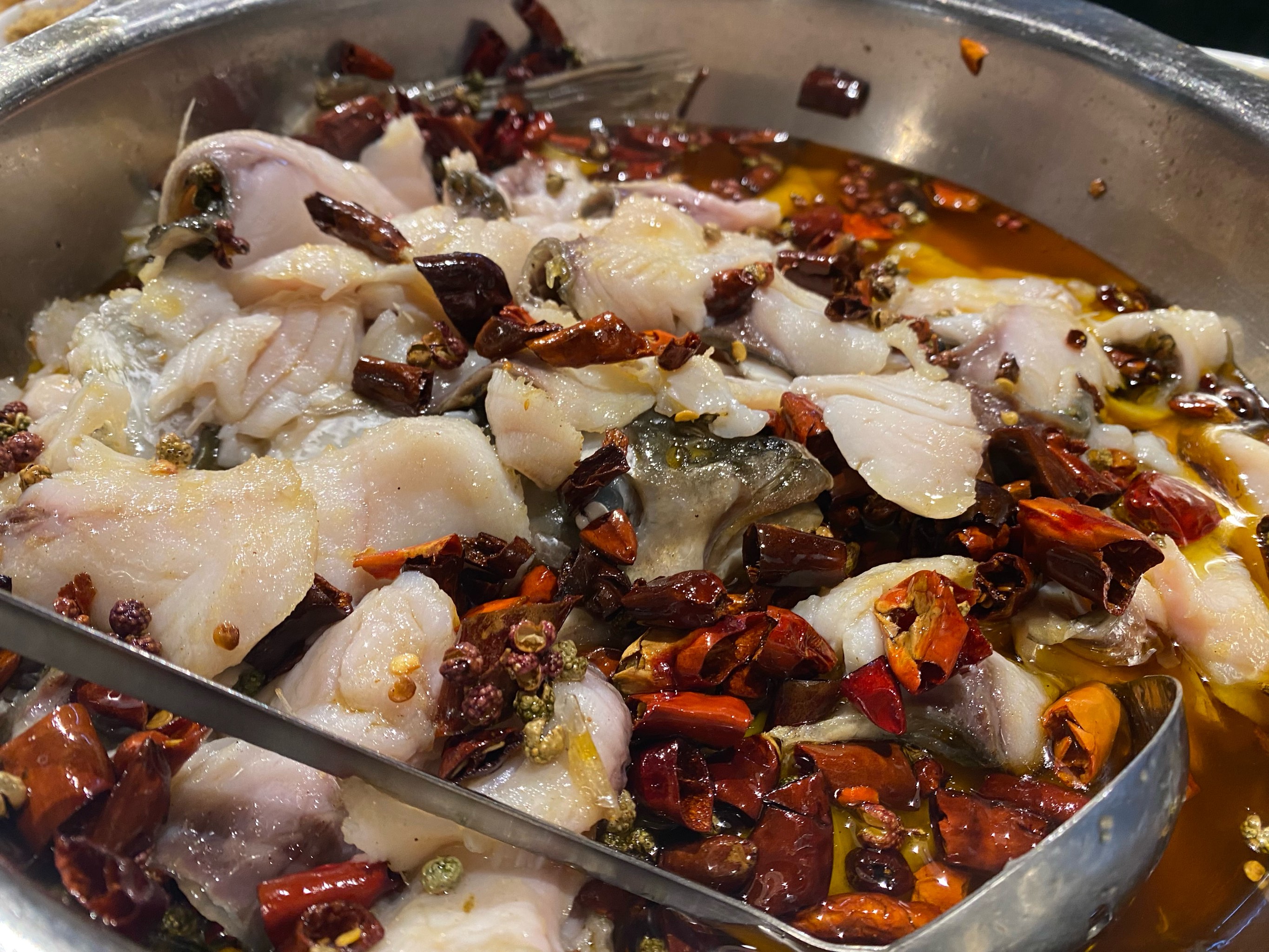 在魚片和底料都烹調(diào)完成后,就到了干辣椒出場以及最著急的時刻了,將干辣椒仍進滾燙的熱油中,再一起淋在魚肉上,噼啪作響,四處飄香,一道有聲有味的美味就完成了。水煮活魚的香與味是否純正,優(yōu)質(zhì)的和正確使用的干辣椒功不可沒。